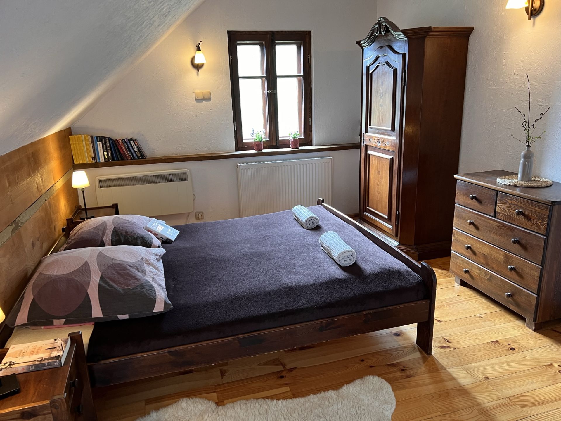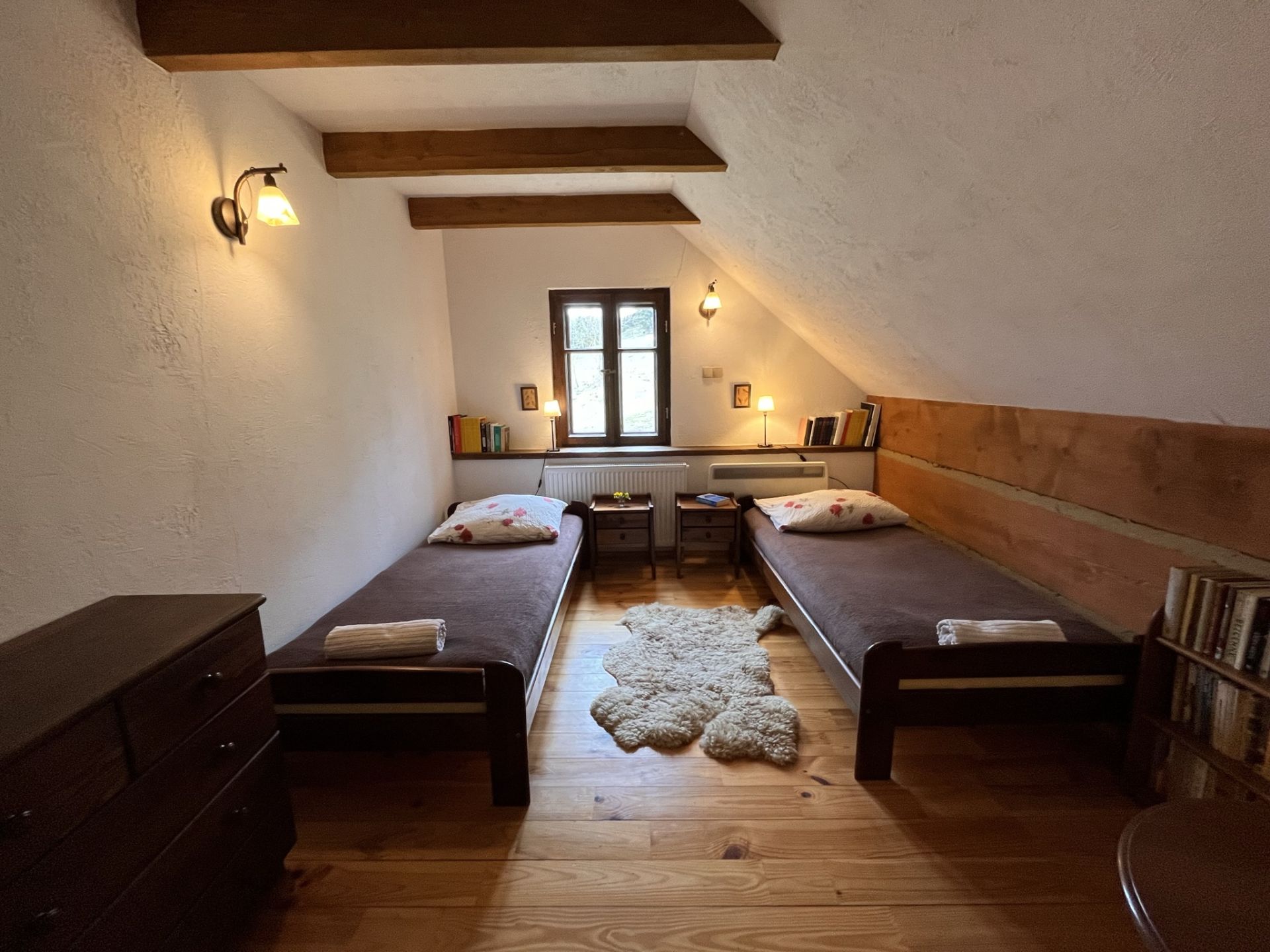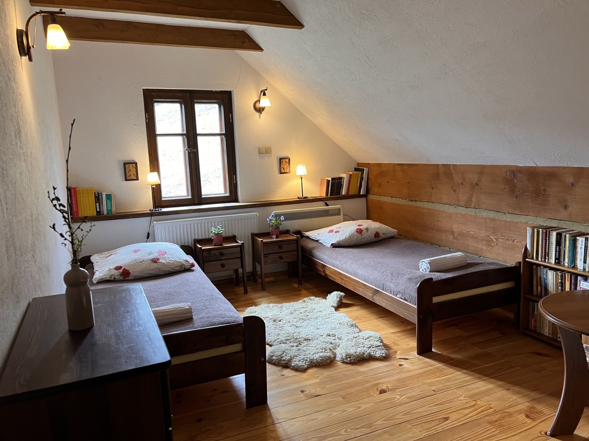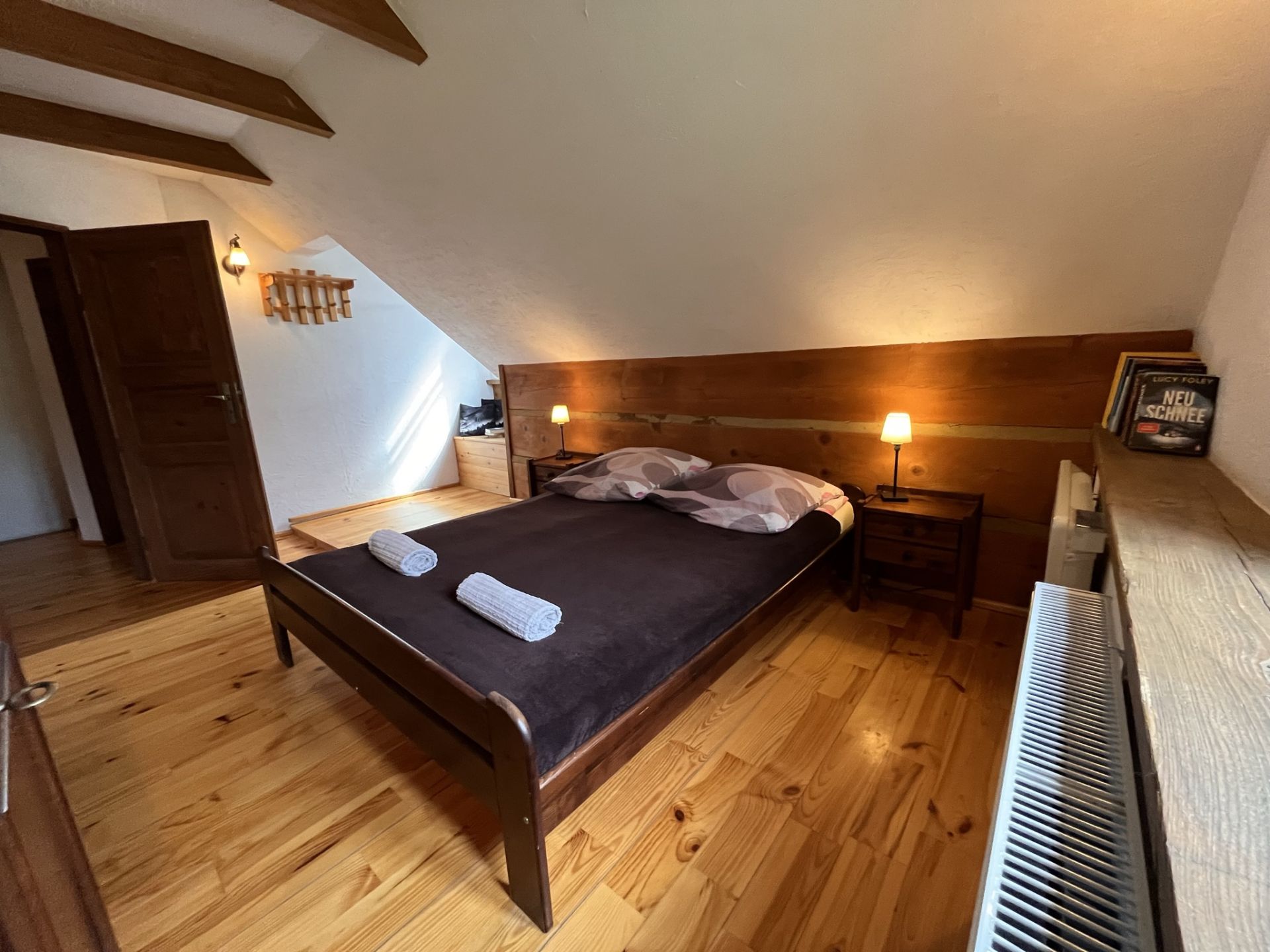 Apartament (praw strona) posiada 4 komfortowe miejsca noclegowe. Na piętrze znajdują się dwie przestronne sypialnie, w jednej z nich dla naszych Gości przygotowane jest łóżko małżeńskie, w drugiej zaś dwa łóżka pojedyncze oraz jednoosobowa sofa. Na tym samym poziomie znajduje się wygodna łazienka z pełnym wyposażeniem sanitarnym. (prysznic, wc, umywalka).