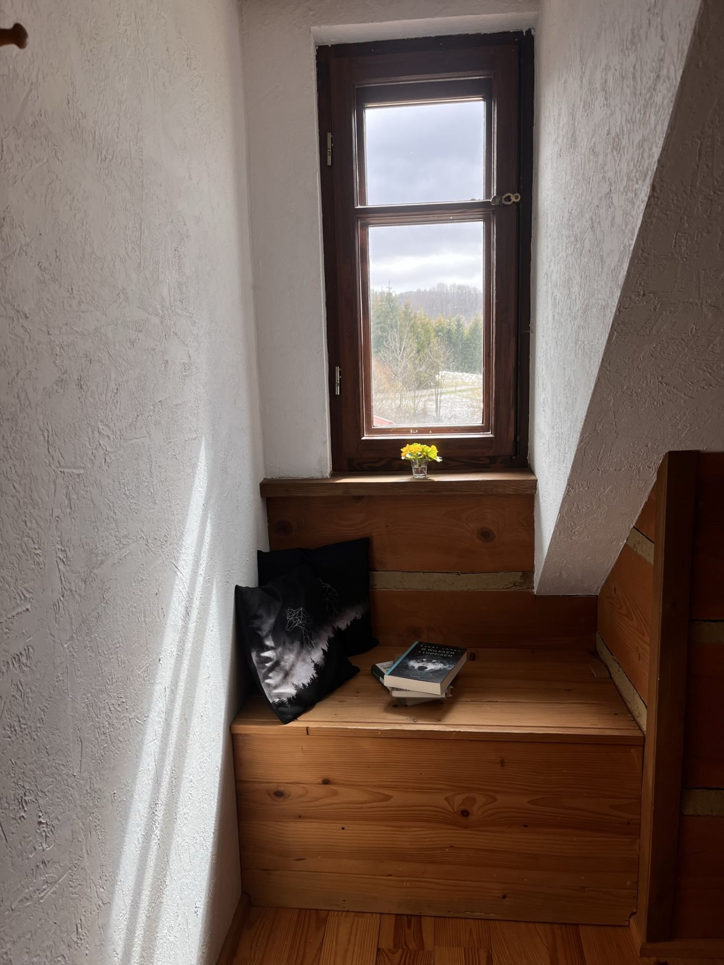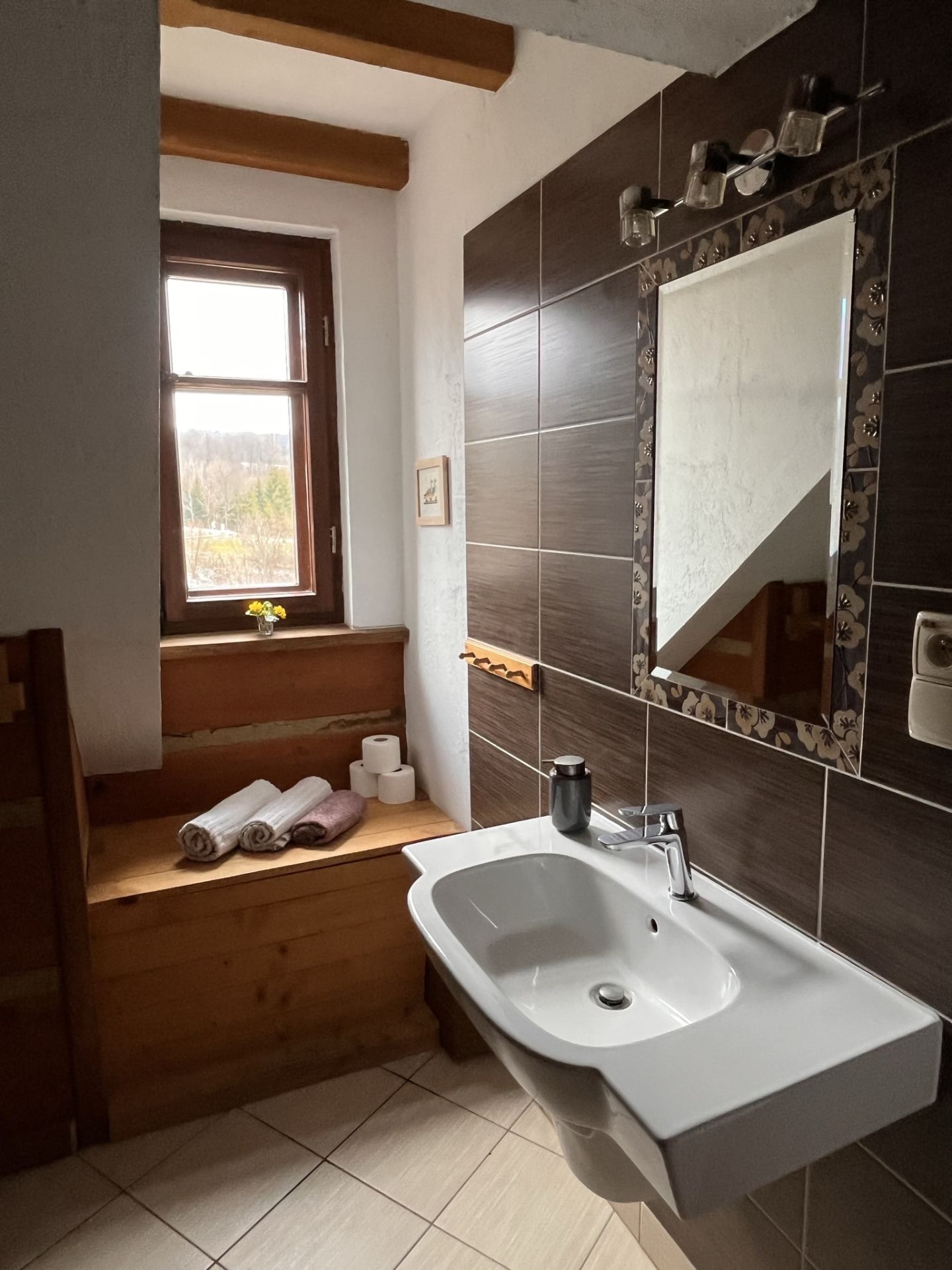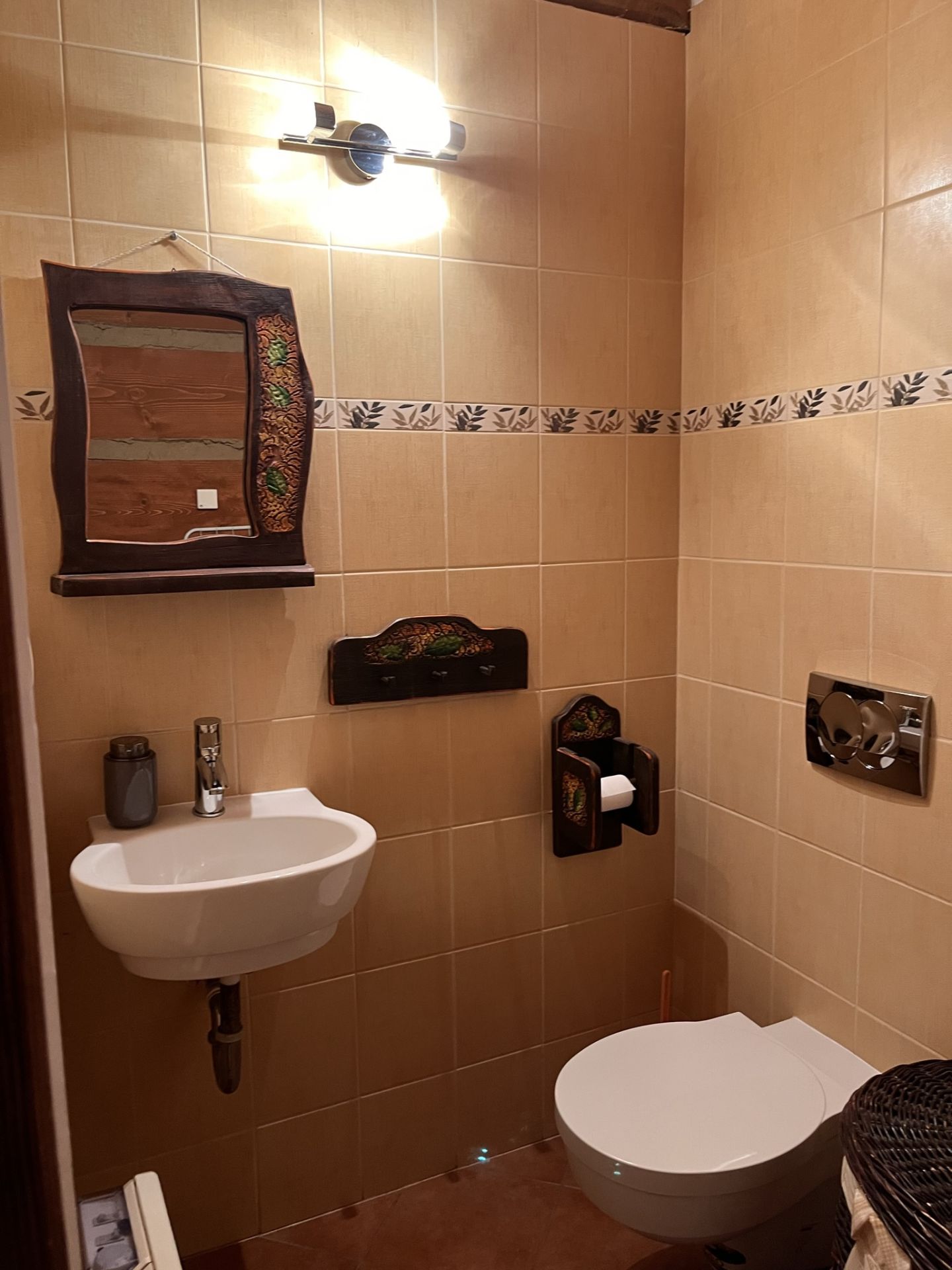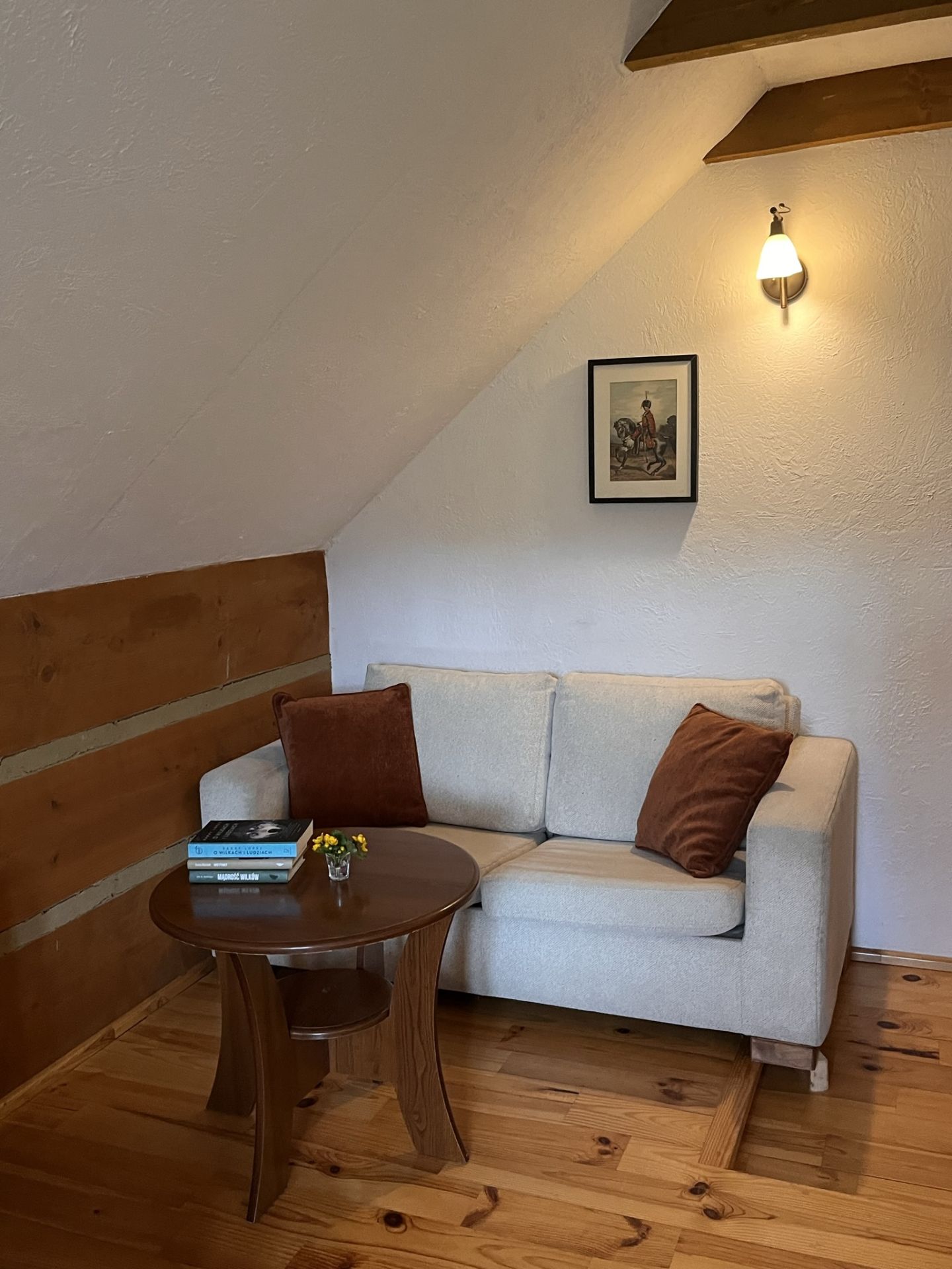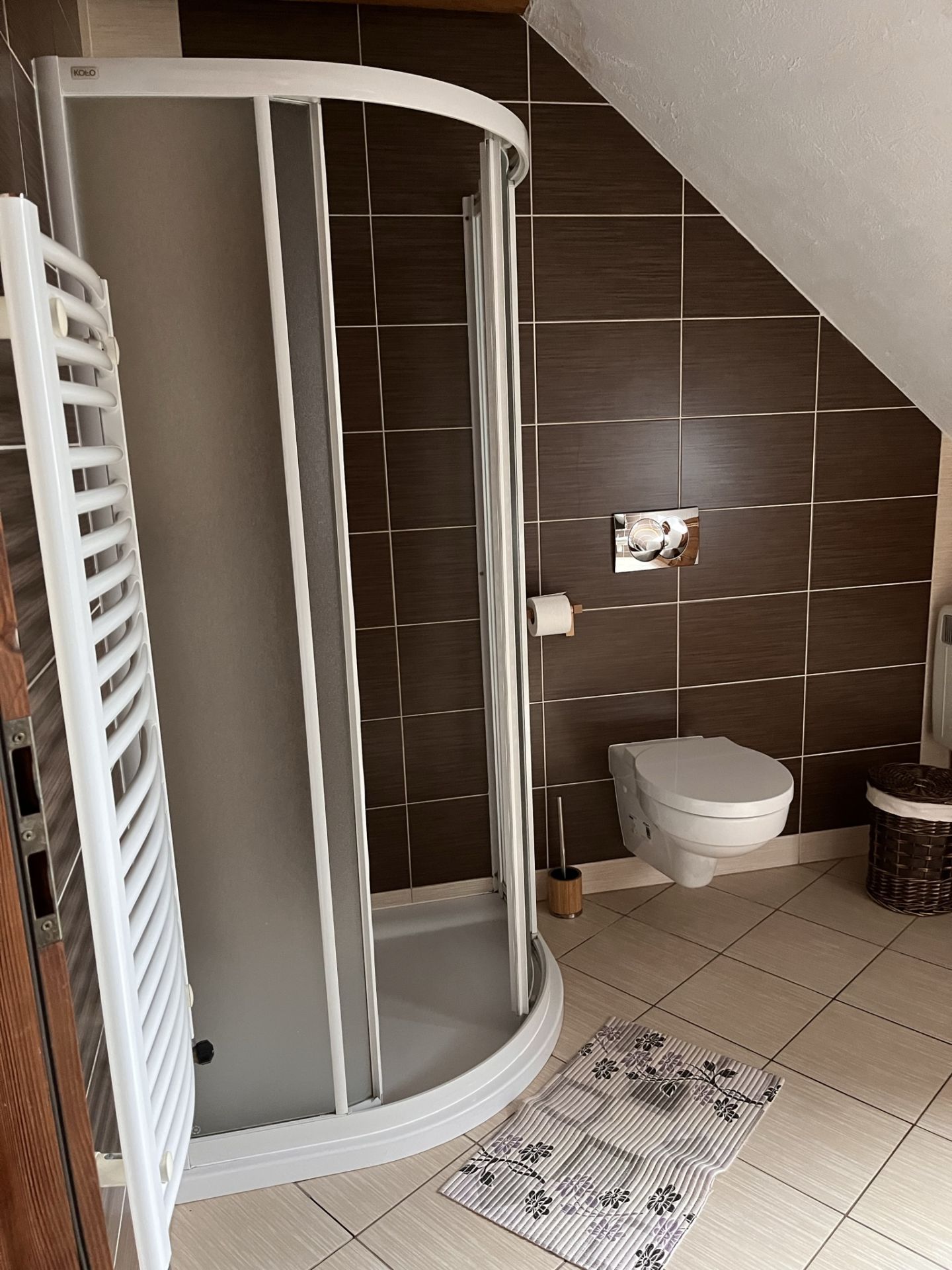 Apartament (praw strona) posiada 4 komfortowe miejsca noclegowe. Na piętrze znajdują się dwie przestronne sypialnie, w jednej z nich dla naszych Gości przygotowane jest łóżko małżeńskie, w drugiej zaś dwa łóżka pojedyncze oraz jednoosobowa sofa. Na tym samym poziomie znajduje się wygodna łazienka z pełnym wyposażeniem sanitarnym. (prysznic, wc, umywalka).